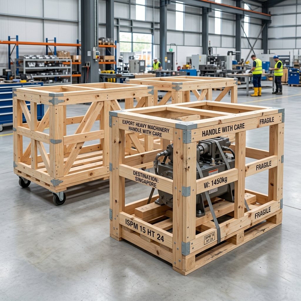 Open-framed reinforced structural crates engineered for high-value heavy machinery integration and export.
